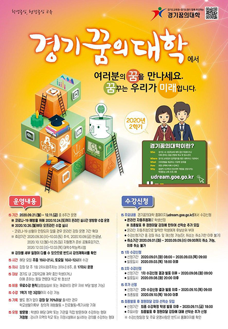 경기도교육청(교육감 이재정)이 9월 1일부터 11일까지 도내 고등학교 학생과 학교 밖 청소년을 대상으로‘2020 경기꿈의대학 2학기 수강 신청’을 받는다.