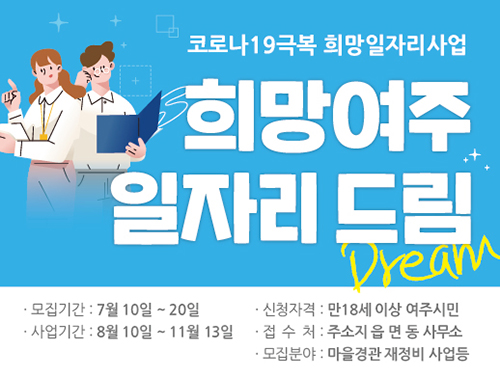 희망여주 일자리 드림 사업은 1일 1,000명 고용을 목표로 하는 대규모 공공일자리 사업으로 8월 10일부터 11월 13일까지 약 3개월간 진행되며