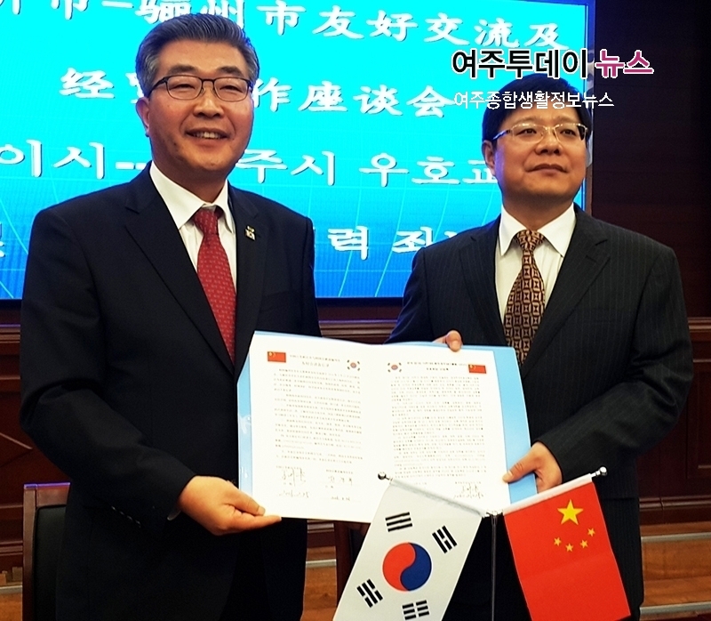 원경희 여주시장과 왕성장 중국 신이시장이 지난 25일 중국 신이시청에서 우호교류 및 경제무역협력 협약을 체결하고 있다.