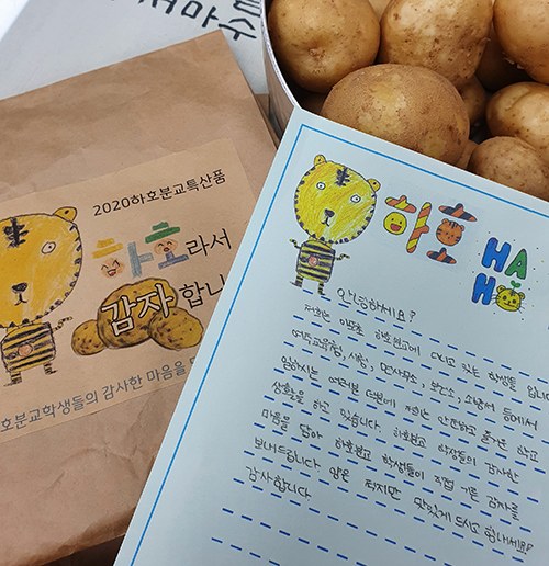 학생들은 올해 첫 수확한 감자를 매일아침 학교방역을 해주는 금사면을 비롯해 교육청, 하호보건지소, 금사소방서 등을 순회하며 학생들이 직접 쓴 손편지와 함께 감사의 마음을 담아 전달했다.