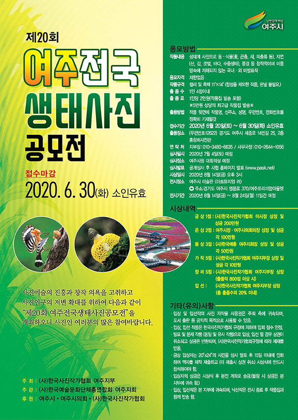 사단법인 한국사진작가협회 여주지부(지부장 박성우)가 올해 20회를 맞는 여주전국생태사진공모전 공모요강을 발표했다.