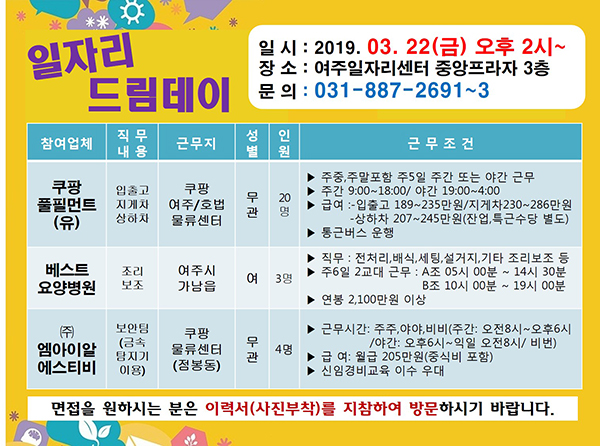 여주시는 오는 22일(금) 오후 2시부터 여주일자리센터에서 ‘2019년 3월 일자리 드림데이’를 개최한다.