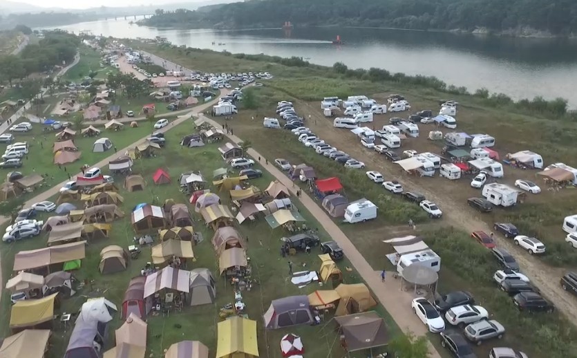 10월 1일부터 3일까지 '여주 뮤직&캠핑 페스티벌 2016' 행사가 펼쳐진 여주 금은모래 강변유원지에서 참가자들이 설치한 1500여 사이트와 캠핑트레일러가 장관을 이루고 있다.