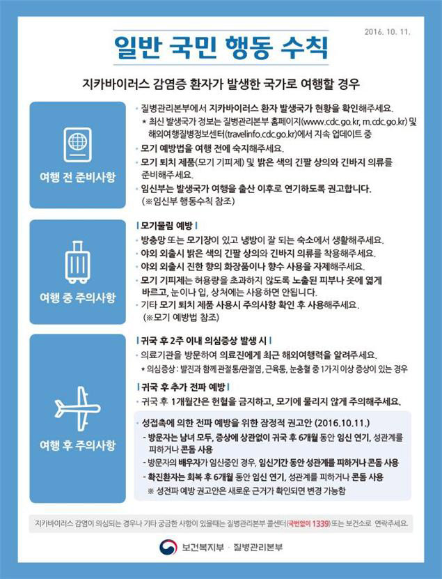 설 연휴 등에 해외여행을 계획하고 있는 경우 여행 전 질병관리본부 모바일 사이트(http://m.cdc.go.kr) 및 질병관리본부 홈페이지 (http://www.cdc.go.kr) 를 통해 지카바이러스 발생국가 현황을 확인할 것을 당부하고,