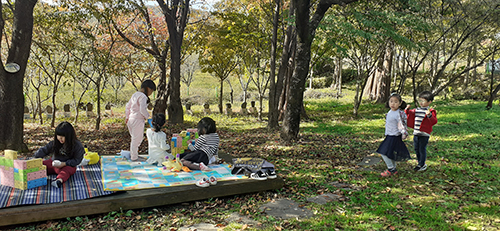 “울긋불긋 가을 숲”을 주제로 11. 4.(월) 이루어진 자연체험활동은 낙엽으로 만들어보기, 열매와 풀잎으로 소꿉장난 하기, 블록을 이용한 숲 속 집짓기 등의 소주제로 나누어 활동을 실시했다.