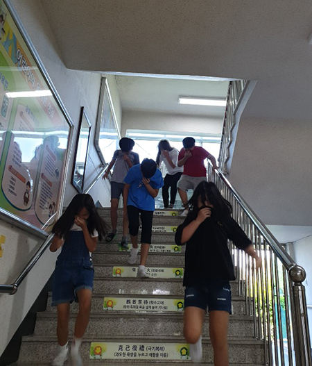 재난대피훈련을 실제처럼 진행하기 위해 학교장이 불시에 비상벨을 눌러 진행한다.