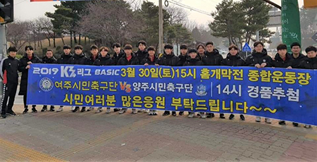 여주시민축구단은 지난 24일 있은 ‘2019 K3리그 베이직’ 개막 1라운드 고양시민축구단과의 경기에서 전반전에 소나기 4골에 이어 후반전에 1골을 추가, 5대1 대승을 거두며 올 시즌 힘찬 출발을 알렸다.