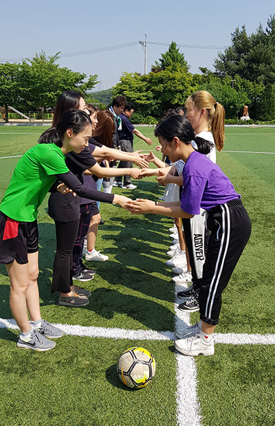 방과 후에 전반전은 여자 학생과 여자 교직원이 10명 내외로 팀을 구성하여 축구 경기를 실시하고 후반전에는 남자 학생과 남자 교직원이 10명 내외로 팀을 구성하여 축구 경기를 실시했다.