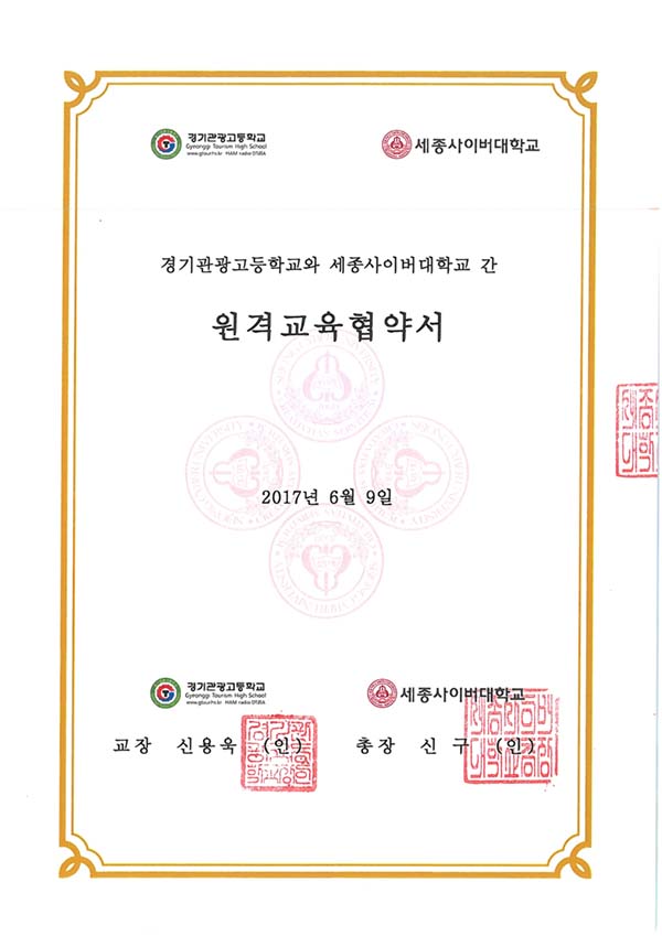 경기관광고등학교(학교장 신용욱)는 21세기 지식정보화 사회구현을 위한 평생교육의 중요성을 인식하고, 이를 실천하기 위하여 2017년 6월 9일 서울세종사이버대학교와 원격교육협약을 체결하였다.