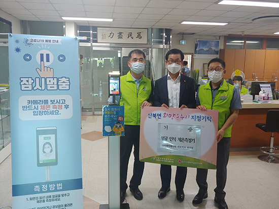지난 20일 ㈜씨엔씨메디텍(대표 최상호)는 산북면행정복지센터(면장 박세윤)에 관내 코로나19차단을 위해 사용해달라며 AI 자동 안면인식 체온측정기(약250만원 상당)을 기탁했다.
