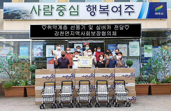 강천면지역사회보장협의체(민간위원장 권영일, 이하 협의체)는 지난 3일 무더위 취약계층 및 거동불편 어르신들을 위해 선풍기 23대, 실버카 20대(400만원 상당)를 준비하고 행복한 전달식을 가졌다.