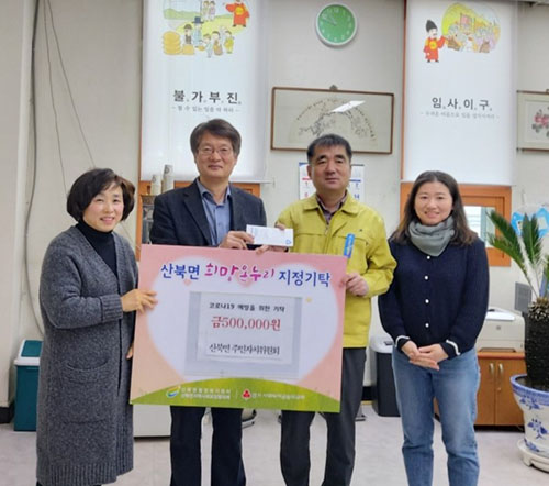 지난 19일 산북면 주민자치위원회(위원장 정석대) 산북면행정복지센터(면장 박세윤)을 방문하여 관내 코로나19 예방을 위해 사용해 달라며 성금50만원을 기탁했다.