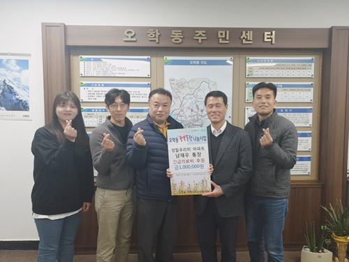 지난 12월 11일 오학동행정복지센터에서 성일우리미아파트 남재우 통장이 과중한 의료비 부담으로 어려운 형편에 있는 이웃을 위해 써 달라며 후원금 1,000,000원을 기탁했다.
