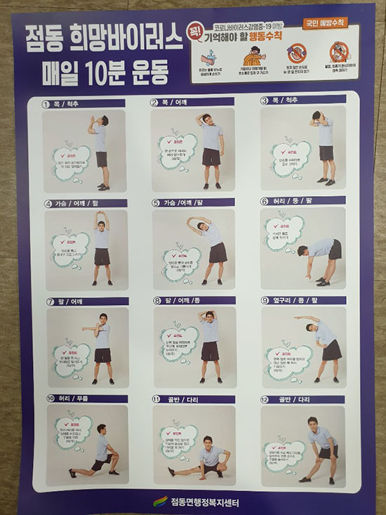 코로나19의 백신과 치료제가 없는 상황에서 가장 중요한 것은 신체적, 정신적 면역력이다. 그러나 운동시설 등 모두 폐쇄되고 주로 집에서 생활하여 움직임이 적어진 주민들의 건강을 위해 『점동 희망바이러스 매일 10분 운동 벽보』를 제작, 수시로 전신 스트레칭을 하여 굳어진 몸을 풀고 건강을 챙길 수 있도록 관내 2,129 전체 가구에 배부했다.